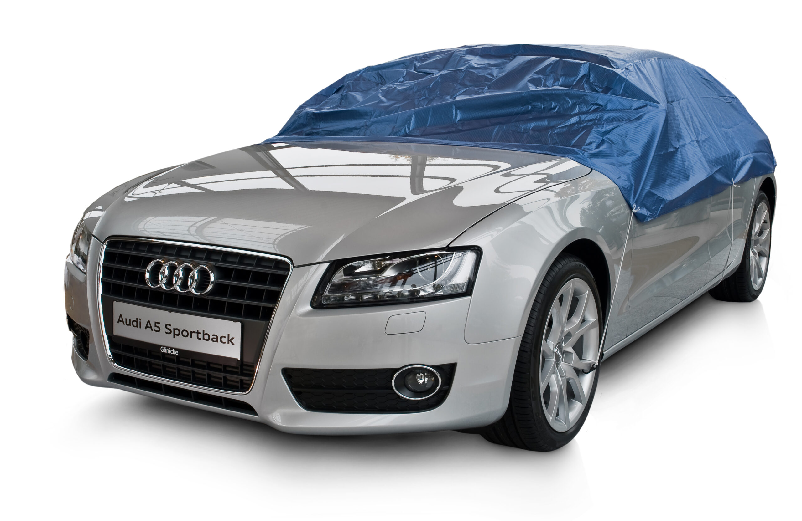 Von einer Person mühelos über das Fahrzeug gezogen, wird diese Halbgarage mit lackschonenden Kunststoffhaken und Gummizügen in den Radkästen befestigt. Abnehmen und losfahren.