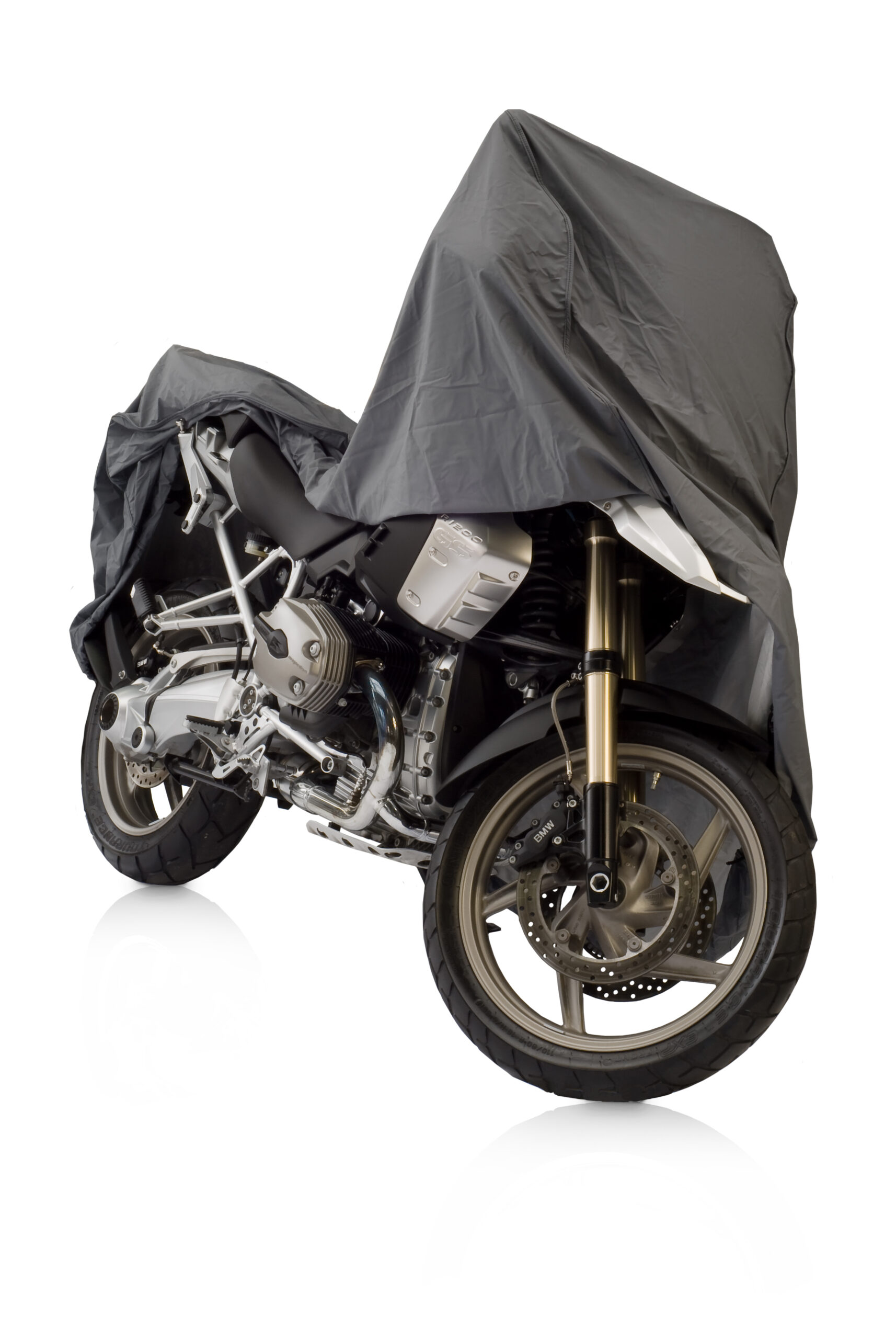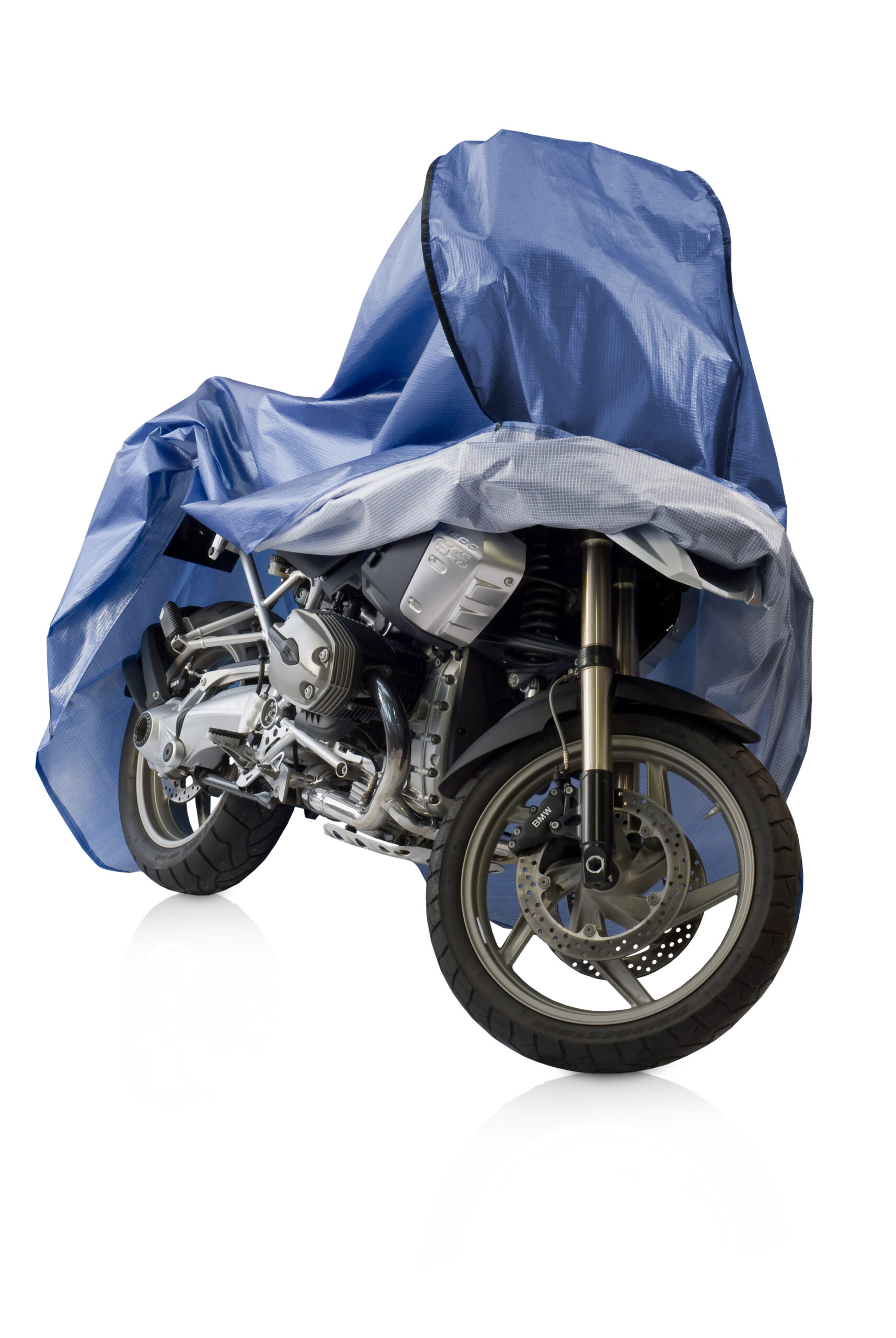 Leichte Zweirad-Abdeckung aus Prägefolie. Frostbeständig, wasserdicht verschweißt und mit Ösen zur Sicherung der Pelerine.